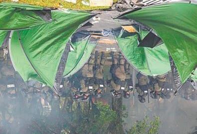 La escena se desarrolló poco después de las 9 de la noche, cuando la Policía, portando cascos y cinchos, así como escudos antidisturbios, se congregaron en la entrada de la prestigiosa universidad.