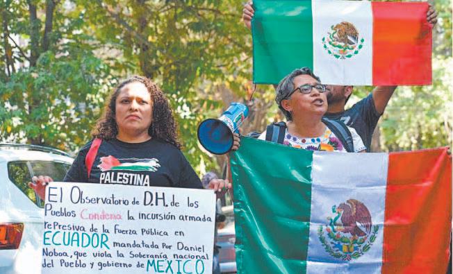 Los manifestantes, algunos con banderas de México, lanzaron consignadas contra el presidente del Ecuador, Daniel Noboa, a quien calificaron de fascista, y le exigieron respeto a la soberanía mexicana.