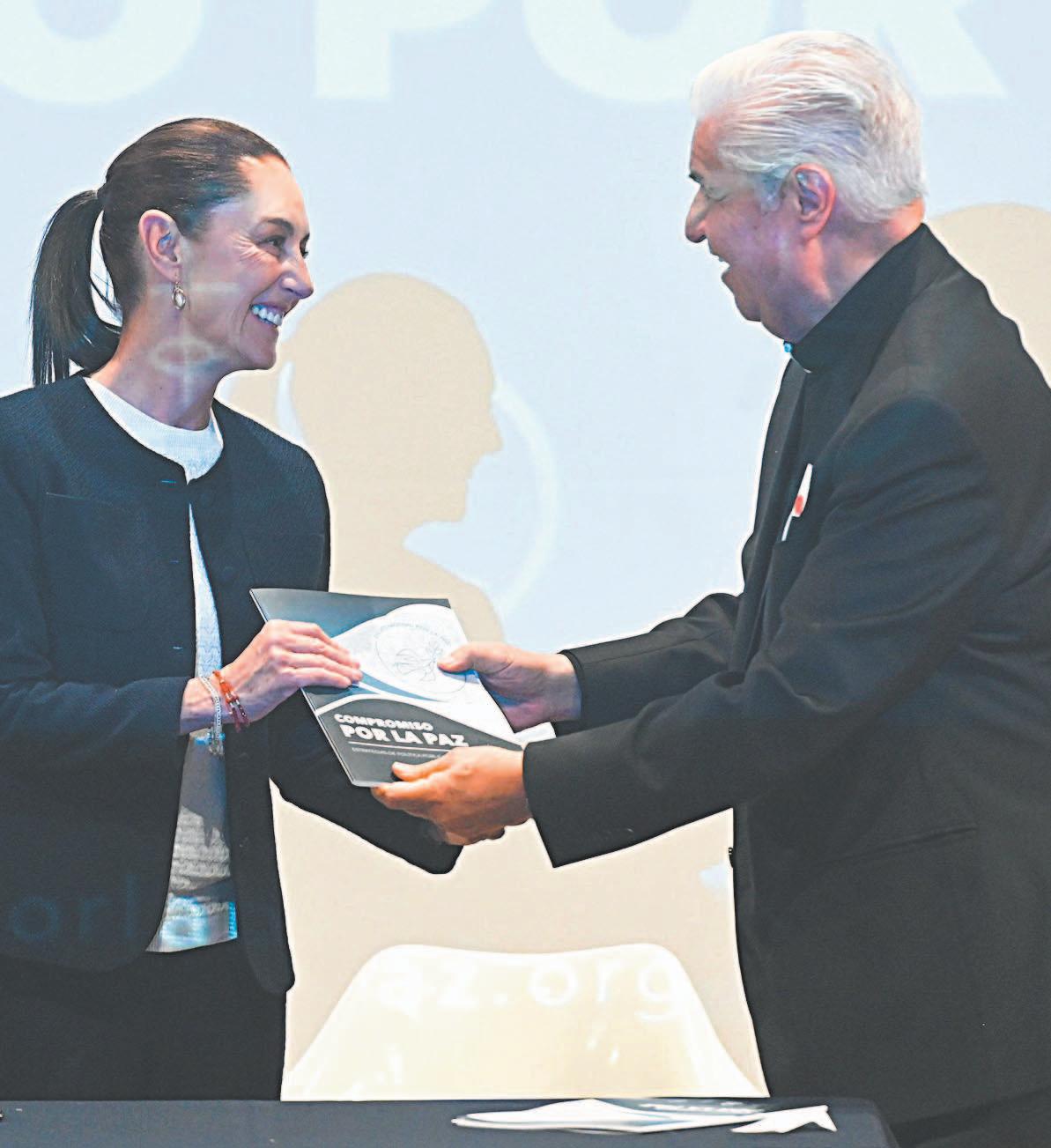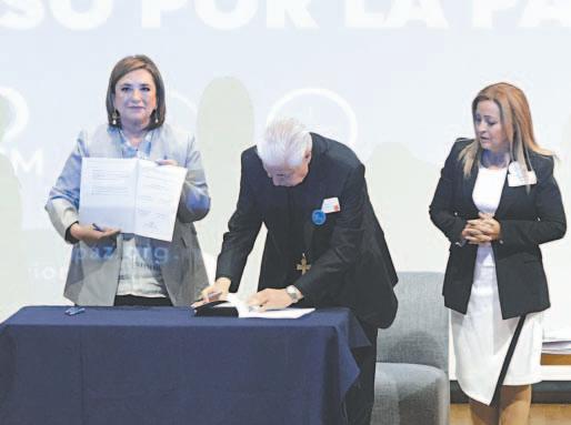 candidatos a la Presidencia de México Claudia Sheinbaum Pardo, por la coalición Sigamos Haciendo Historia -Morena, PT y PVEM-; Xóchitl Gálvez Ruiz, de Fuerza y Corazón por México -PAN, PRI y PRD-, y Jorge Álvarez Máynez, de Movimiento Ciudadano, firmaron ayer el Compromiso por la Paz, que consiste en 117 iniciativas enfocadas a combatir la violencia propuestas por la Conferencia del Episcopado Mexicano (CEM).