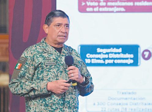 959 integrantes de las Fuerzas Armadas y Guardia Nacional garantizan la seguridad de instalaciones relacionadas con la ejecución de los comicios, entre ellas: Papelera Pachisa, Talleres Gráfi cos de México, Centro Logístico de Distribución del INE y los consejos distritales, explicó el General Secretario durante el informe quincenal de seguridad