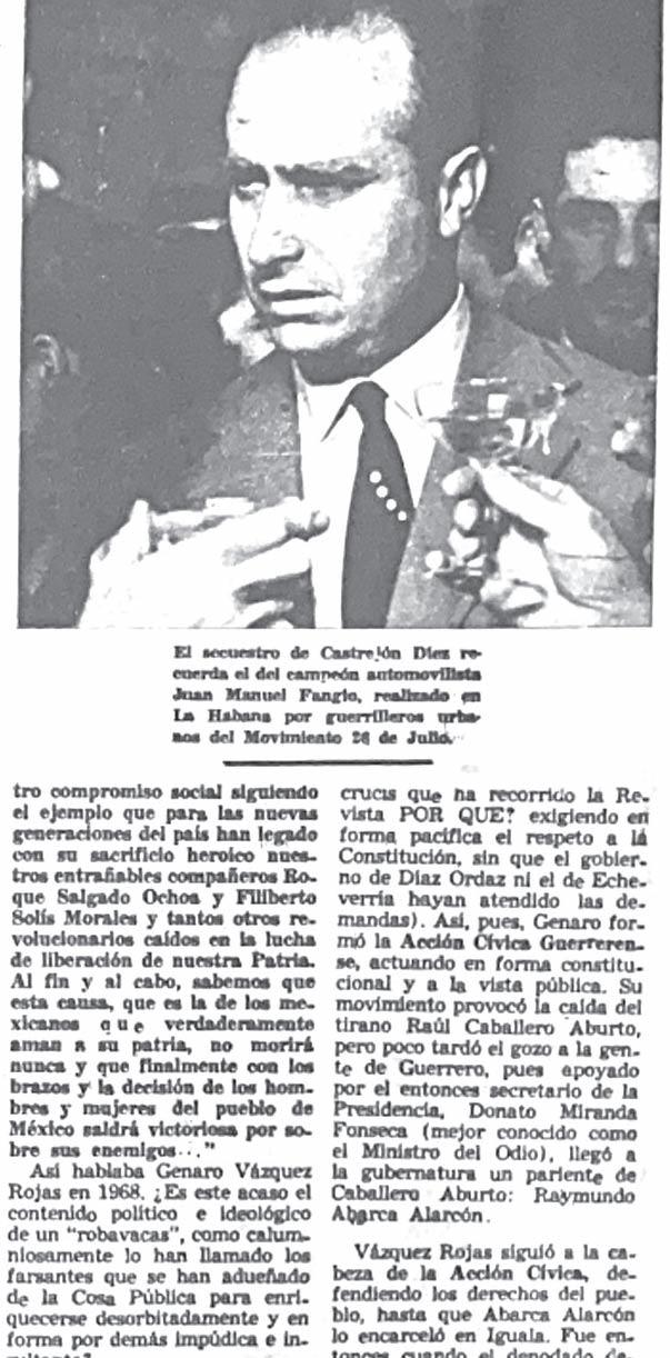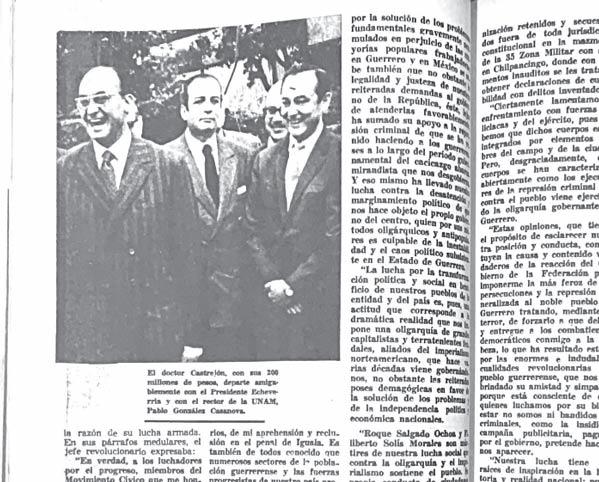 doctor Jaime Castrejón Díez, quiero dejar pública constancia de que debido a la total ausencia de garantías ciudadanas y a la presión gubernamental como consecuencia del peligro de muerte del rector de la Universidad de Guerrero; debido a que en México sólo por la fuerza revolucionaria pueden salir de la cárcel los presos políticos, y a que el régimen se negó a aceptar mi libertad incondicional dentro de la República Mexicana, toda vez que desde hace casi dos años burla mis derechos constitucionales al tenerme encarcelado bajo falsas, inventadas absurdas acusaciones —¡sin que siquiera se me haya cerrado el arbitrario proceso que se instruye!—; debido a todo ello, repito, me veo forzado a abandonar el país en circunstancias que desconozco, con la confianza de que mis compañeros presos políticos. —más de doscientos sean puestos en libertad por el Gobierno, dentro de la Patria,