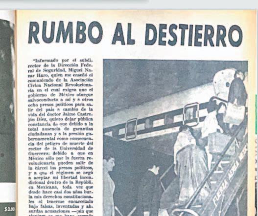 “Informado por el subdirector de la Dirección Federal de Seguridad, Miguel Nazar Haro, quien me enseñó el comunicado de la Asociación Cívica Nacional Revolucionaria en el cual exigen que el gobierno de México otorgue salvoconducto a mí y a otros ocho presos políticos para salir del país a cambio de la vida del