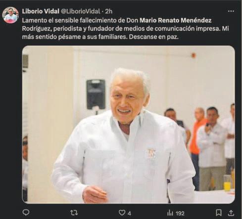 Mauricio Vila, gobernador de Yucatán, escribió en redes sociales: “Lamento el sensible fallecimiento de Mario Renato Menéndez Rodríguez, periodista y fundador de los diarios Por Esto! Envío mi más sentido pésame a sus familiares y amigos. Descanse en paz.