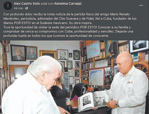 Luis López González, diplomático de la embajada cubana en México, escribió en su cuenta: “Desde la Embajada de Cuba en México extendemos nuestras más sentidas condolencias por el fallecimiento de Mario Renato Menéndez Rodríguez, periodista, fundador de los diarios Por Esto! y gran amigo de Cuba”.