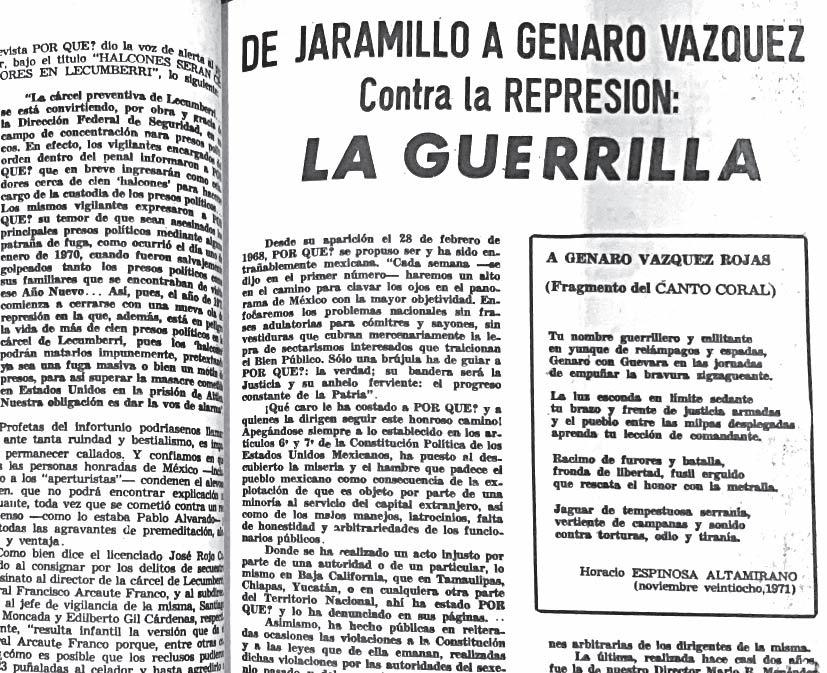 bemos la lucha permanente por la libertad de expresión y la libertad democrática, a través de sus revistas conocimos a personajes tan emblemáticos como Genaro Vásquez y Lucio Cabañas, y nos creó conciencia sobre la situación, gracias a las revistas Por qué? y Por Esto!, los jóvenes de esa época lo admiramos profundamente y buscábamos las revistas para procurarnos información que no publicaba la prensa