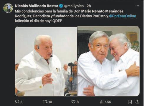 Nicolás Mollinedo Bastar, quien fuera el chofer del presidente Andrés Manuel López Obrador, se sumó al pésame: “Mis condolencias para la familia de Don Mario Renato Menéndez Rodríguez, Periodista y fundador de los Diarios Por Esto! fallecido el día de hoy! QDEP”.