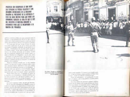 mete en este acto y para siempre con la juventud de México que lucha por la libertad; los postulados que ustedes sostienen, son los nuestros; hacemos nuestra, por eso, íntegramente sin reservas todas las exigencias planteadas por el estudiantado y su cuerpo de maestros progresista, lo mismo de las suscritas por la Asamblea de Estudiantes y Maestros de las Carreras de Ciencias Políticas, Sociología y Antropología Social de la Universidad Iberoamericana de fecha de 15 de agosto que las firmadas en la declaración pública del Consejo Universitario de la UNAM, el 17 del propio mes, porque el respeto y restricto a la autonomía universitaria, la no intervención del Ejército de otras fuerzas del orden público en la resolución de problemas de la universidad y demás centros de educación superior, la reparación de daños materiales causados en planteles universitarios por fuerzas públicas, el respeto de las garantías individuales y sociales que consagra la Constitución, sin el cual se quebranta el sistema jurídico que se ha otorgado soberanamente al pueblo mexicano, la libertad de estudiantes presos y la indemnización en favor de las víctimas de los recientes acontecimientos la determinación de la responsabilidades de las autoridades involucradas en los hechos mencionados y la aplicación de sanciones correspondientes, la sujeción de las funciones de las fuerzas públicas a los lineamientos de las Constitución Federal, la supresión de los cuerpos policia-