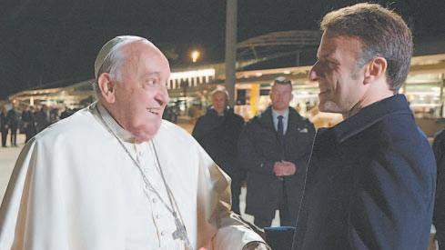 dente francés, Emmanuel Macron, en el aeropuerto. “Es un gran honor para la ciudad de Ajaccio, para Córcega y para Francia recibirlo”, le dijo el jefe de Estado. Macron también le regaló el libro oficial de la restauración de la catedral de Notre Dame. (Agencias)