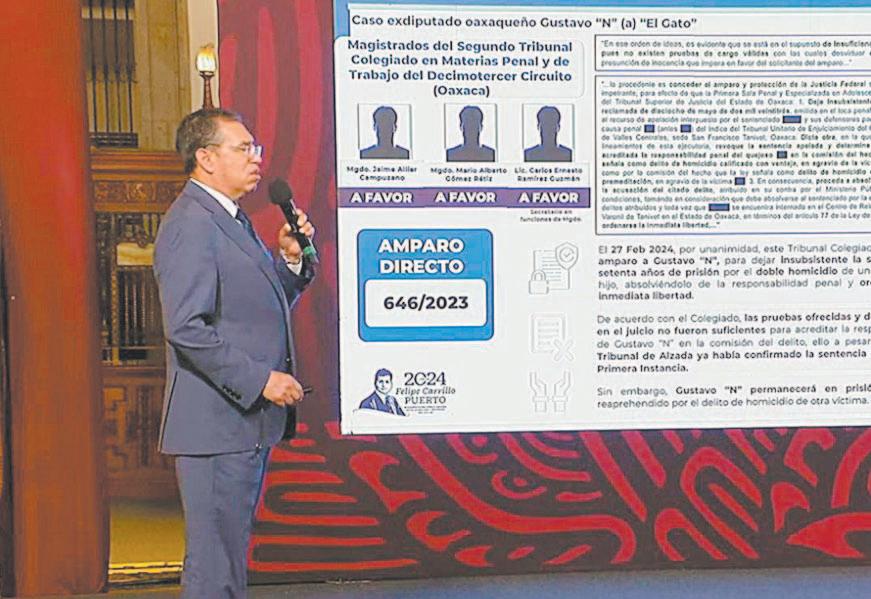 En la mañanera del presidente Andrés Manuel López Obrador, el subsecretario de Seguridad, Luis Rodríguez Bucio, explicó que, en el caso del exdiputado, el Tribunal Colegiado integrado por los magistrados Jaime Aller Campuzano, Mario Alberto Gómez y Carlos Ernesto Ramírez, otorgaron un amparo al exlegislador para dejar insubsistente la sentencia de 70 años de prisión por el doble homicidio de una mujer y su hijo, absolviéndolo de la responsabilidad penal y ordenando su libertad.