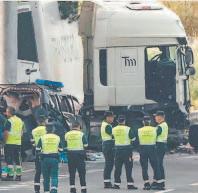 Pedro Carmona, del sindicato de guardias civiles AUGC, dijo a la televisión pública TVE que el conductor “perdió el control” del camión y “arrolló a los vehículos que se encontraban en el punto de control”. Había un segundo conductor del camión, que estaba durmiendo cuando ocurrió todo, añadió Carmona. (Agencias)