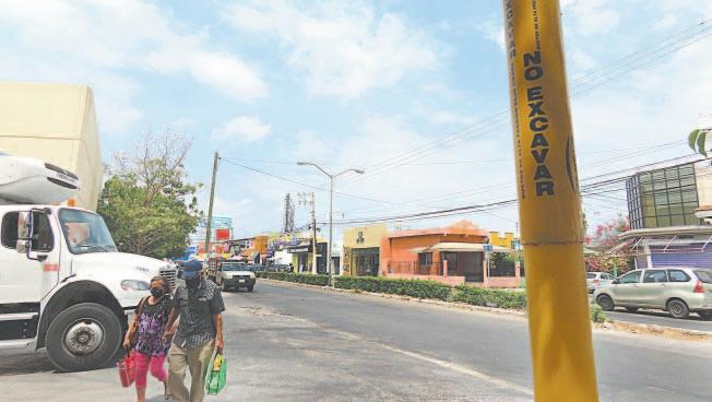 LA empresa Tractebel fijó letreros junto a los paraderos, en aceras y cerca de las plazas Dorada y Las Américas, con leyendas que evidencian el alto riesgo que corren las personas que transitan por ahí.- (Saraí Manzo)