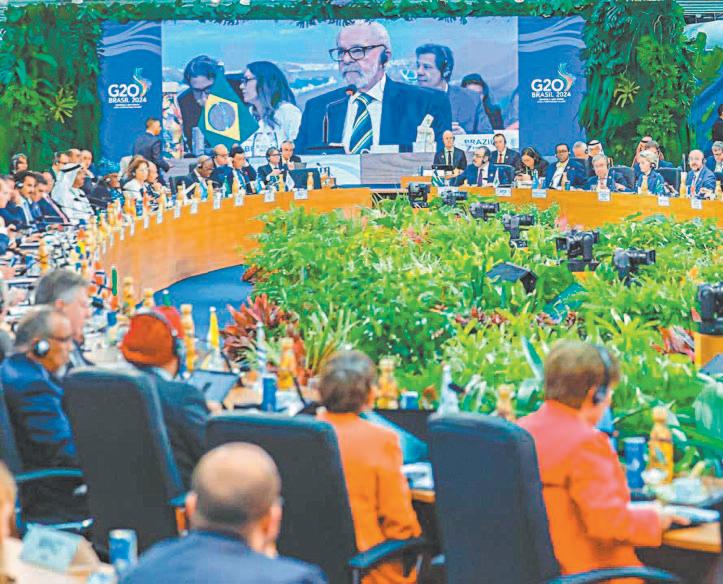 portante y representativo espacio de deliberación política y económica del mundo, después del Consejo de Seguridad, actualmente paralizado, el cual reúne a los 20 países más ricos e infl uyentes, a los miembros permanentes del Consejo de Seguridad, a todos los países nucleares, excepto Israel si lo fuera, el presidente Luiz Inacio Lula da Silva, en su calidad de anfitrión, logró encerrar el cónclave en una burbuja , al pedir que no se hablara de guerra. De ese modo, aunque algo se habló de ello, dio un carpetazo y obvió los enormes peligros que entraña la guerra en Europa que está punto de derivar en un confl icto nuclear, omitió la tragedia que se vive en Gaza, la agresión al Líbano y el enfrentamiento entre Israel e Irán. De ese modo, los mandatarios en cuyas manos está la solución de esos y otros problemas, después del importante retrato de familia, tomaron sus aviones y se marcharon a casa. La guerra es fea, cruel y apesta; mejor no hablar de ella. ¡Curiosa solución!