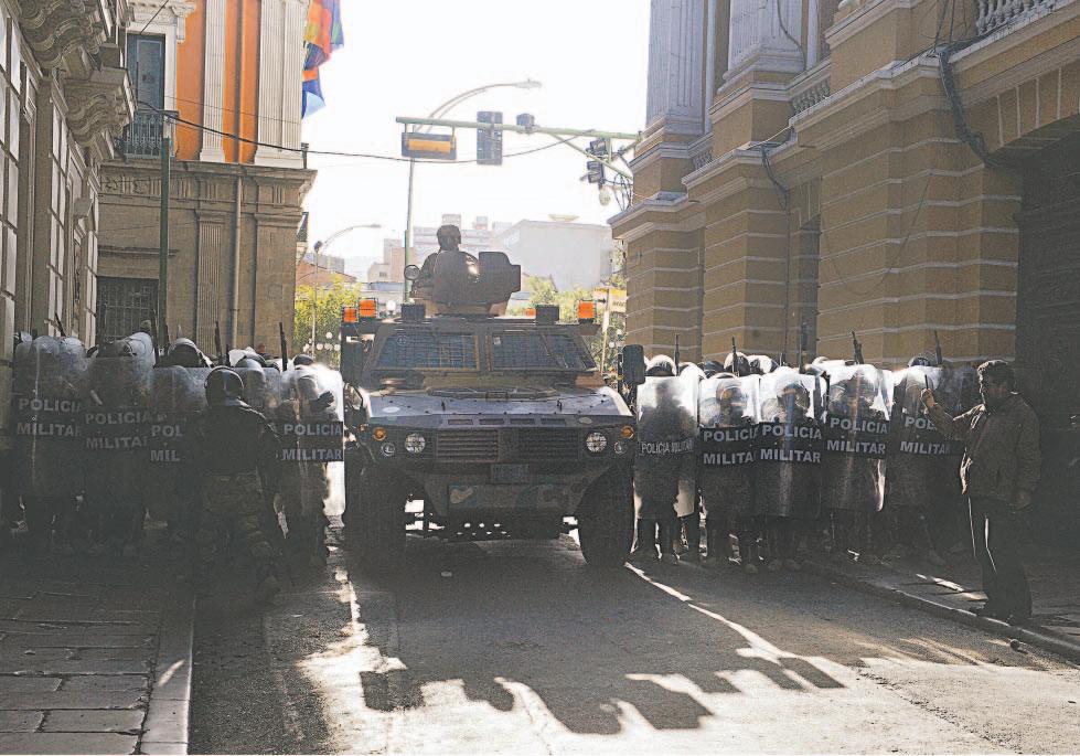 Con equipo táctico y armas de alto calibre, efectivos bolivianos rodearon la plaza frente al Palacio de Gobierno. Además, se reportó la presencia de francotiradores. Alrededor de las 15:50 hora local, un tanque tiró las puertas de la sede del Ejecutivo de Bolivia y elementos del Ejército accedieron al recinto.