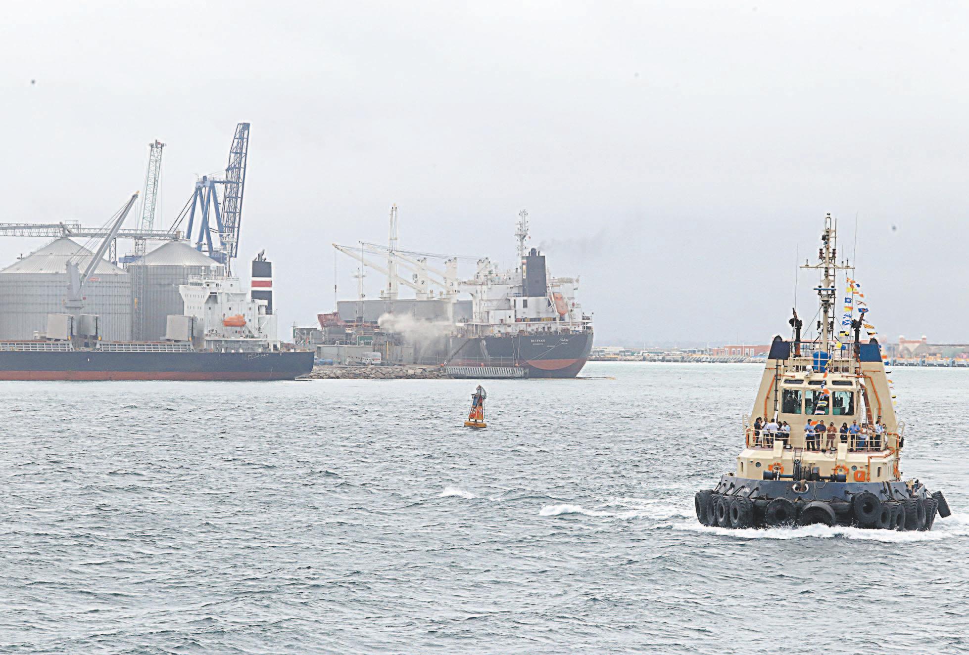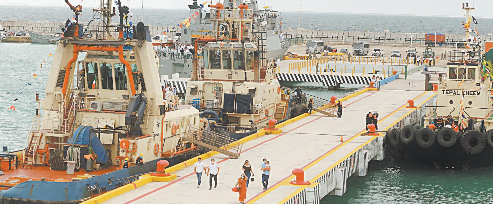 de la Guardia Costera y de la Policía desplegados muy cerca de los escombros y del portacontenedores averiado.