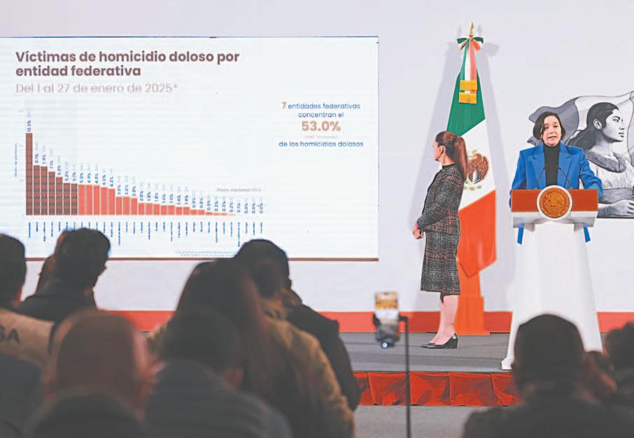 CIUDAD DE MÉXICO.- La Estrategia Nacional de Seguridad ha permitido una reducción del 27% en el promedio diario de víctimas de homicidio doloso desde el 2018 hasta el 27 de enero de este año, de acuerdo con la presidenta Claudia Sheinbaum Pardo, quien Durante su conferencia matutina, la titular del Ejecutivo federal indicó que la disminución en los indicadores delictivos en resultado de la coordinación de todas las dependencias y destacó que el Gabinete de Seguridad trabaja todos los días para garantizar la paz y la seguridad. Al presentar el informe de incidencia delictiva, la secretaria ejecutiva del Sistema Nacional de Seguridad Pública, Marcela Figueroa Franco, aseguró que, entre el 1 y el 27 de enero de 2025, se registró un promedio diario de 65.8 víctimas de homicidio doloso, con una proyección de 73 al cierre del mes. Esta cifra representa una disminución del 27% en comparación con 2018, cuando el promedio diario era de 100.5 víctimas.