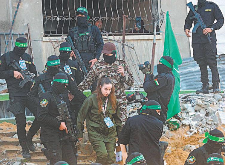 de Hamás armados y enmascarados, mientras portaba en las manos un diploma y se le pedía que saludara a los espectadores.
