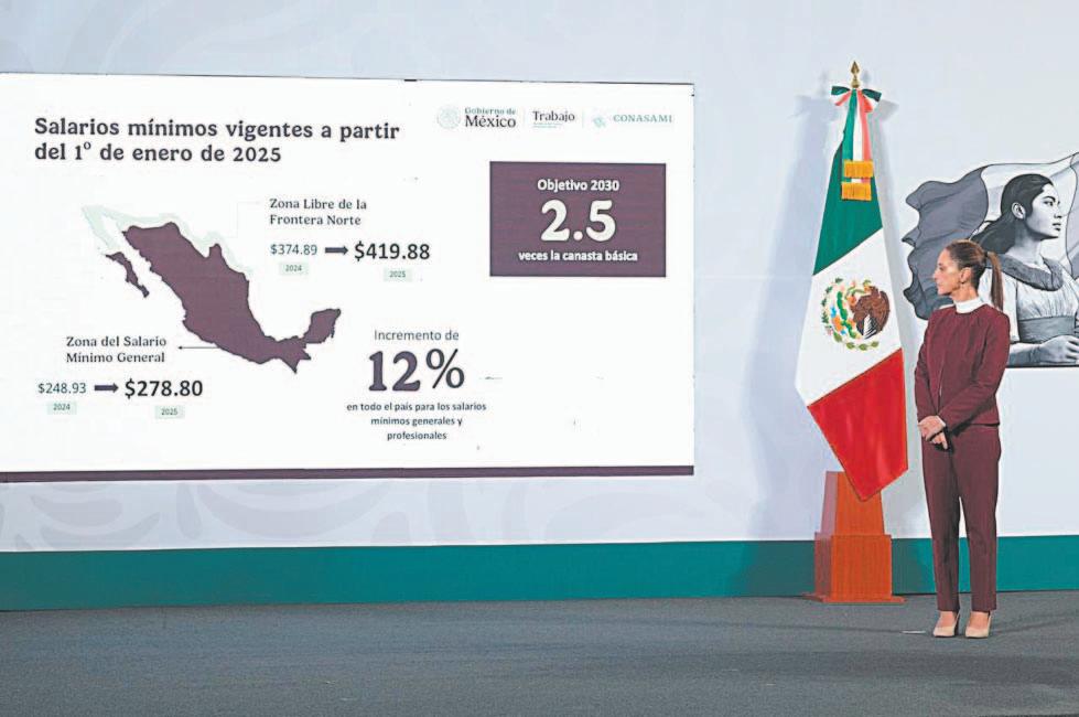 CIUDAD DE MÉXICO.- Luego de un acuerdo entre el Gobierno federal con los sectores obrero y empresarial, el salario mínimo para el 2025 tendrá un incremento de 12% en todo el país, debido a que aumentará de 248.93 a 278.80 pesos diarios en la Zona del Salario Mínimo General y en la Zona Libre de la Frontera Norte pasará de 374.89 a 419.88 pesos diarios, anunció ayer la presidenta Claudia Sheinbaum.