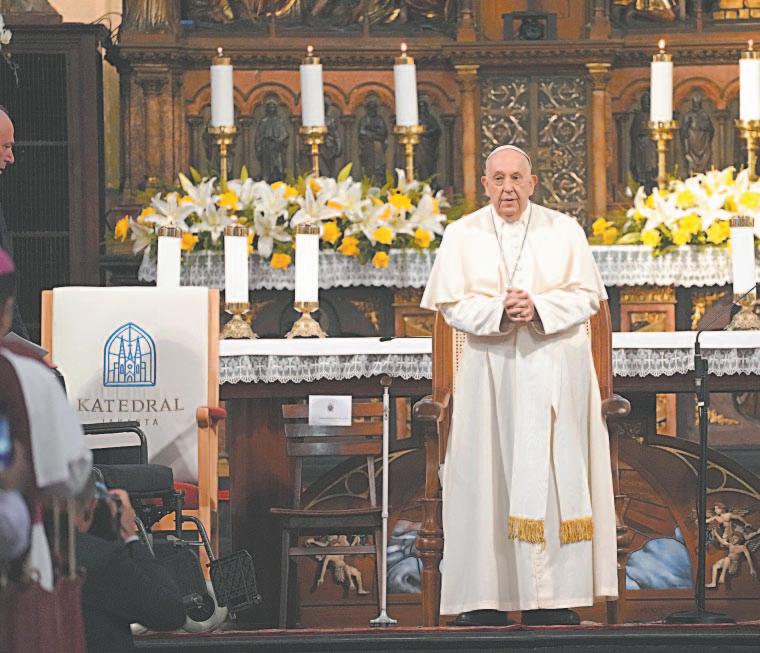 Al fi nal de una jornada de más de 10 horas, Francisco se dio un baño de masas, estrechando la mano de los fi eles con entusiasmo. “¡Viva el Papá!”, gritaban cientos de personas congregadas detrás de las barreras alrededor de la Catedral de Yakarta mientras el Santo Padre se dirigía en silla de ruedas hacia su automóvil. Cientos de niños y jóvenes con trajes tradicionales y banderas de Indonesia y del Vaticano recibieron a Francisco, que también presenció un desfile militar y escuchó los himnos de ambos países.