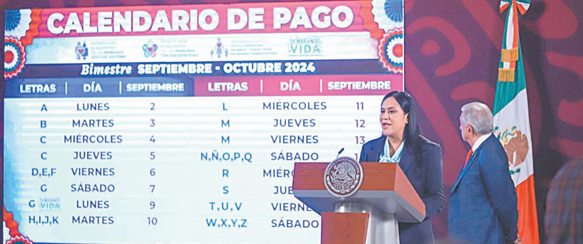 CIUDAD DE MÉXICO.- Al manifestar que fue misión cumplida, Ariadna Montiel Reyes, secretaria de Bienestar, informó que esta semana inició el pago de pensiones y programas del Bienestar, como la Pensión de Adultos Mayores y de Personas con Discapacidad, correspondiente al bimestre septiembre-octubre, del lunes 2 al sábado 21 de septiembre, el cual será el último que se realizará en el Gobierno del presidente Andrés Manuel López Obrador. En conferencia de prensa matutina, la Secretaria detalló que el siguiente pago será en el mes de noviembre, ya bajo el Gobierno de Claudia Sheinbaum Pardo, pues recordó que los programas del Bienestar son un derecho constitucional y continuarán en el próximo sexenio.