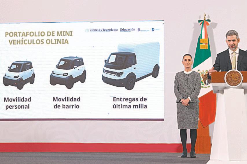CIUDAD DE MÉXICO.- El Gobierno federal presentó ayer Olinia, la primera armadora de mini vehículos eléctricos desarrollados en México, con la propuesta de crear tres modelos: uno de uso personal, otro para movilidad de barrio y otro para entregas de última milla.