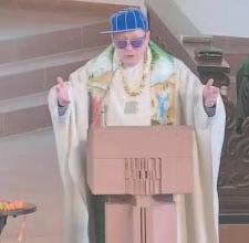 Con una gorra azul y blanca colocada de lado, unas gafas de sol moradas con brillantes y una cadena de oro en la que ponía “HipHop”, el cura decidió convertirse en un rapero para cantar su sermón.