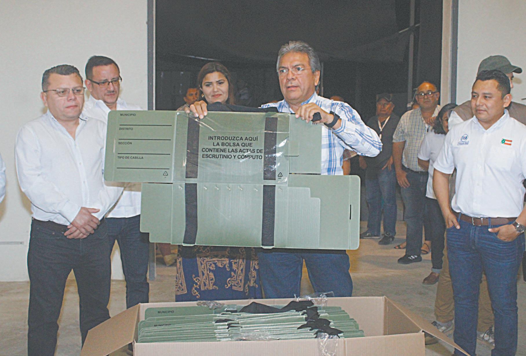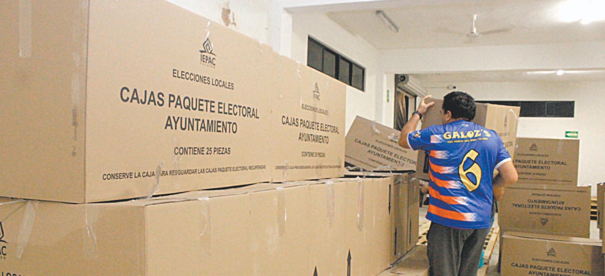 LOS consejeros del Instituto Electoral y de Participación Ciudadana y representantes de partidos políticos recibieron anoche tres mil 150 cajas con documentos que se emplearán en la votación de regidores de los 106 Ayuntamientos. En próximas fechas se entregarán las urnas y mamparas para completar los insumos.- (Edgar Ek)