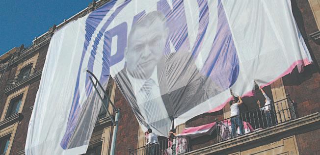 La figura del exjefe de la Policía flanqueada por el logo del PAN y la leyenda #GarcíaLunaNoSeToca, provocó chiflidos y reclamos de los asistentes, hasta que desde pisos de abajo, un grupo de personas jaló y rompió la lona hasta bajarla.