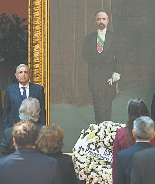 El presidente Andrés Manuel López Obrador conmemoró el 110 aniversario luctuoso de Francisco I. Madero en el patio de honor del Palacio Nacional, acompañado por su esposa, Beatriz Gutiérrez Müller, y su gabinete legal y ampliado.