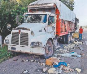 Mujer sobrevive de milagro al proyectarse contra camioneta Rapiñan pollos tras aparatoso choque de tráiler y un Torton