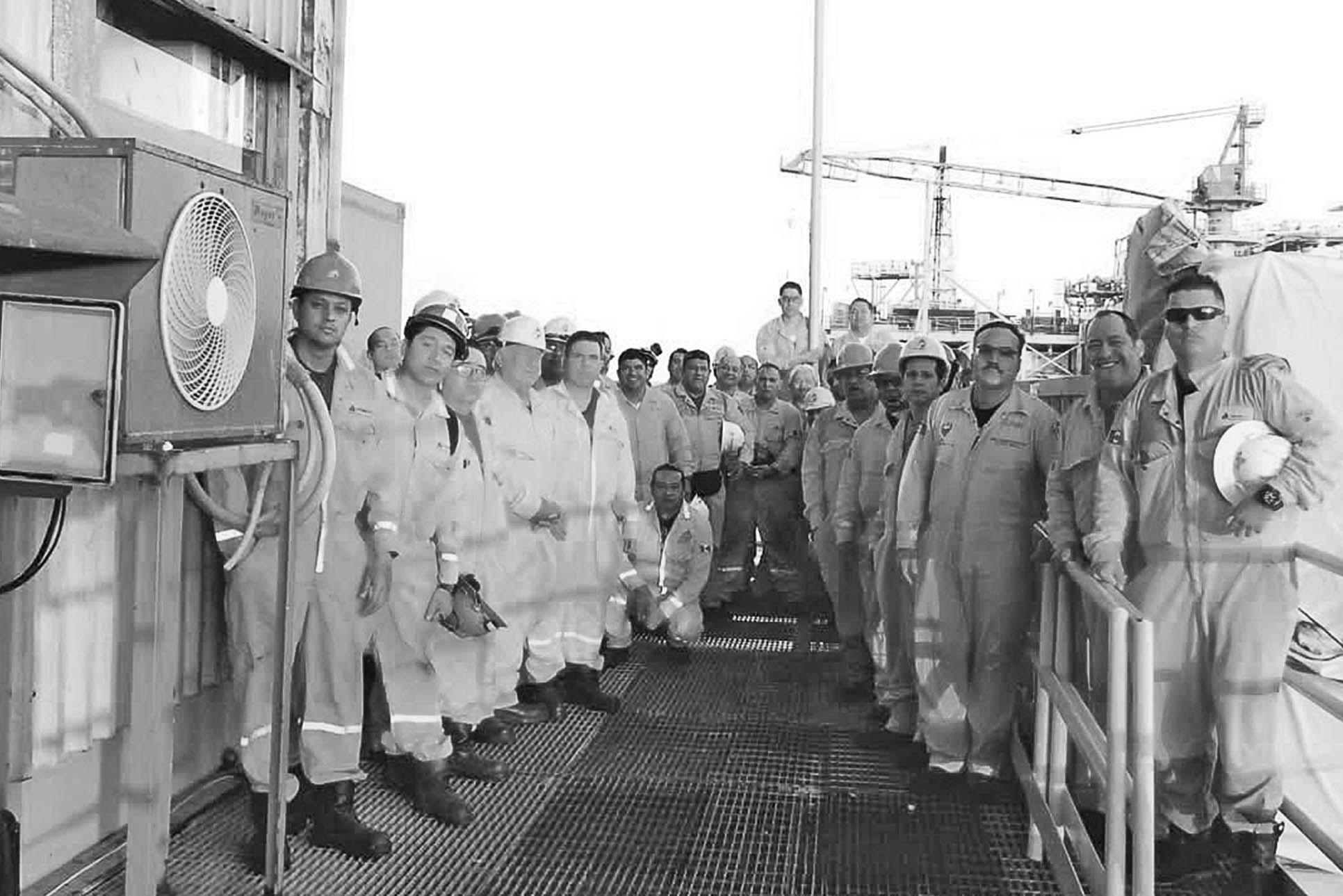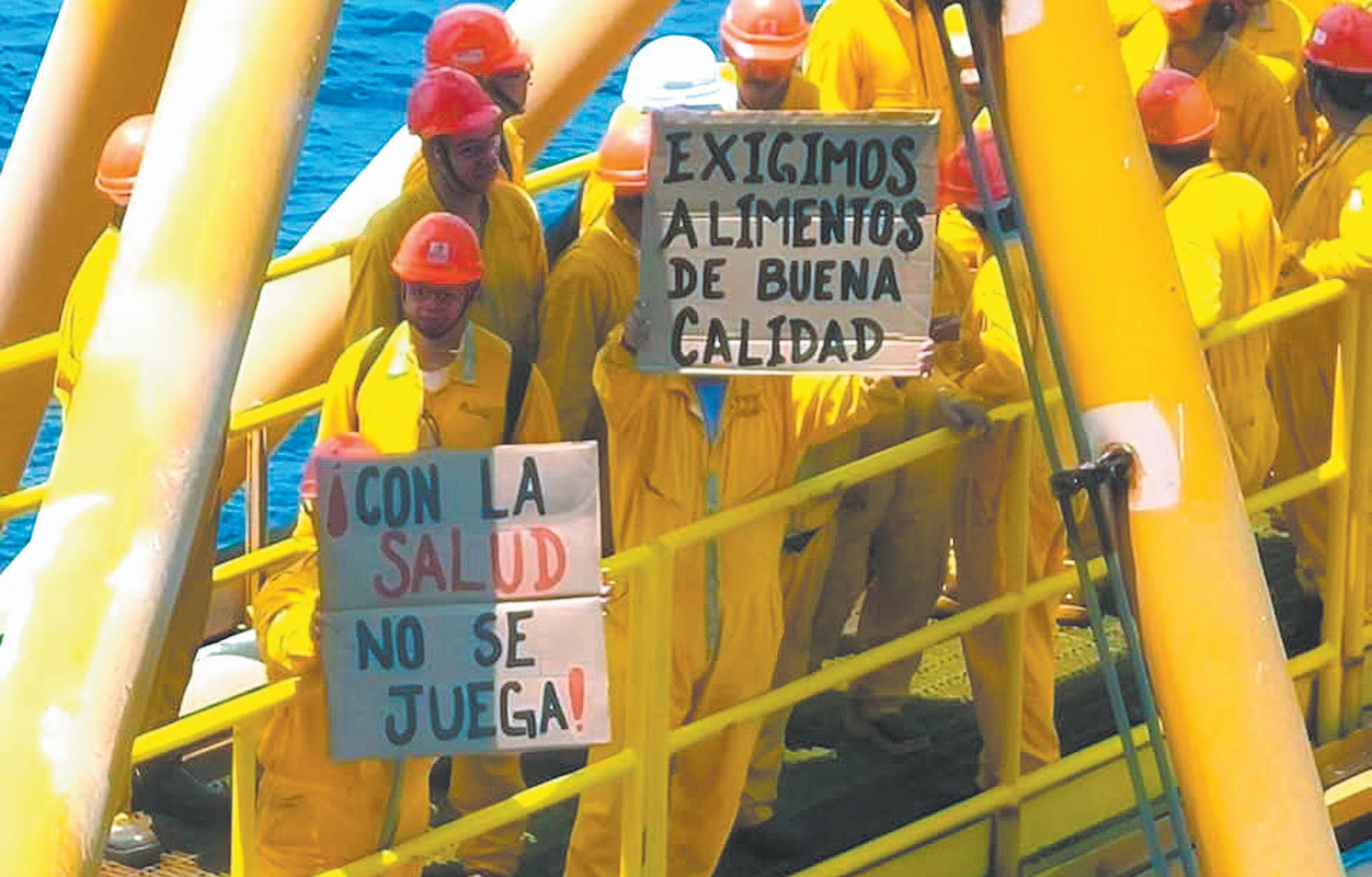 MÁS de 200 obreros de la plataforma Pol-A, en la Sonda de Campeche, protestaron por el incumplimiento en el abastecimiento de comida; reprochan que solo reciben huevo, arroz, frijol y tortilla, la mayoría de las veces echado a perder, lo que les ha causado enfermedades gastrointestinales.-