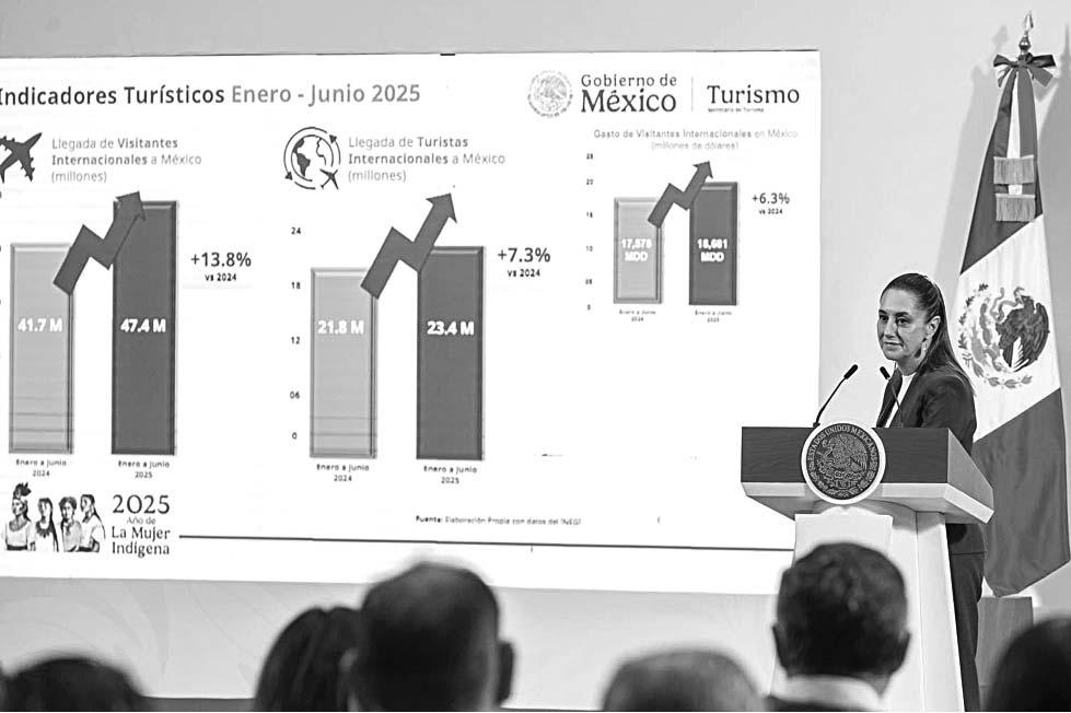 CIUDAD DE MÉXICO.- De enero a junio de 2025, se registró la llegada de 47.4 millones de visitantes internacionales a México, lo que representa 13.8% más respecto al mismo periodo en 2024, informó ayer la titular de la Secretaría de Turismo (Sectur), Josefina Rodríguez Zamora. Durante la conferencia matutina de la presidenta Claudia Sheinbaum, la funcionaria aseguró que México está de moda y refirió que hay dos indicadores diferentes: los visitantes y los turistas que pernoctan.