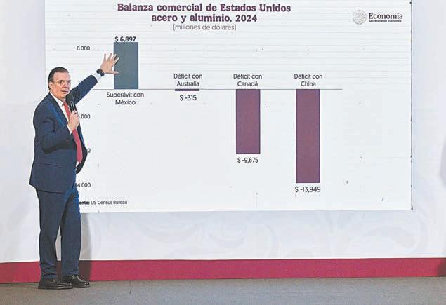 CIUDAD DE MÉXICO.- El Gobierno de México anunció ayer que solicitará consultas con Estados Unidos para exponerle sus argumentos acerca del impacto que representará la imposición del arancel de 25% a las importaciones de acero y aluminio. Durante la conferencia matutina de la presidenta Claudia Sheinbaum Pardo, el secretario de Economía, Marcelo Ebrard Casubón, rechazó a nombre de la Federación la decisión que tomó el presidente estadounidense Donald Trump asegurando que no se justifica esa tarifa y es injusto porque México importa más acero de Estados Unidos. Ebrard fundamentó su postura alegando que en el comercio del acero y el aluminio Estados Unidos tiene un superávit con México de 6 mil 897 millones de dólares.