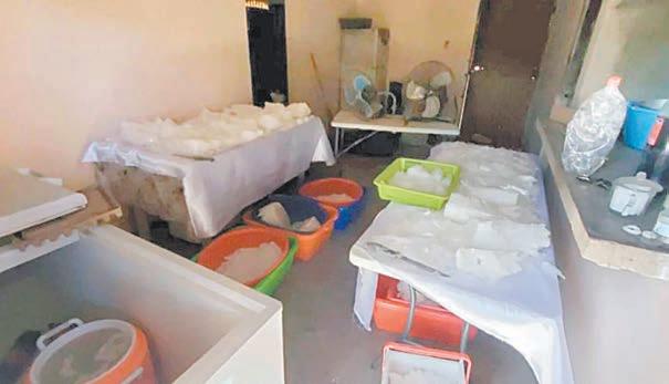 CULIACÁN, Sin.- En un operativo realizado en Culiacán, Sinaloa, fueron asegurados 4 mil 700 litros de metanfetamina líquida y 269 kilos de metanfetamina en tres inmuebles usados para la producción y distribución de drogas. La autoridades de seguridad informaron que con esta acción se evitó la circulación de 4 mil 969 toneladas de la sustancia, equivalentes a 4 mil 969 millones de dosis, con un impacto económico estimado en mil 462 millones de pesos para los grupos delictivos. Los inmuebles se localizaron en el poblado de Ayuba, que pertenece a Culiacán, Sinaloa, durante patrullajes de vigilancia. A través de una tarjeta informativa se informó que al detectar actividades sospechosas, se ejecutaron órdenes técnicas de investigación de manera simultánea en los tres domicilios. Tras el hallazgo de la droga, los tres inmuebles quedaron bajo resguardo policial y se notificó al Ministerio Público para su debido proceso.