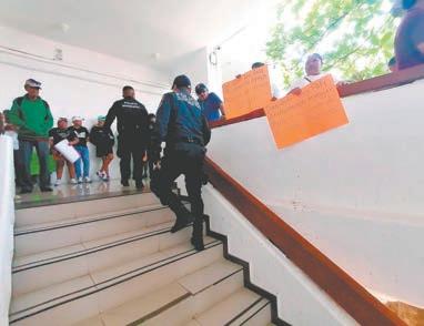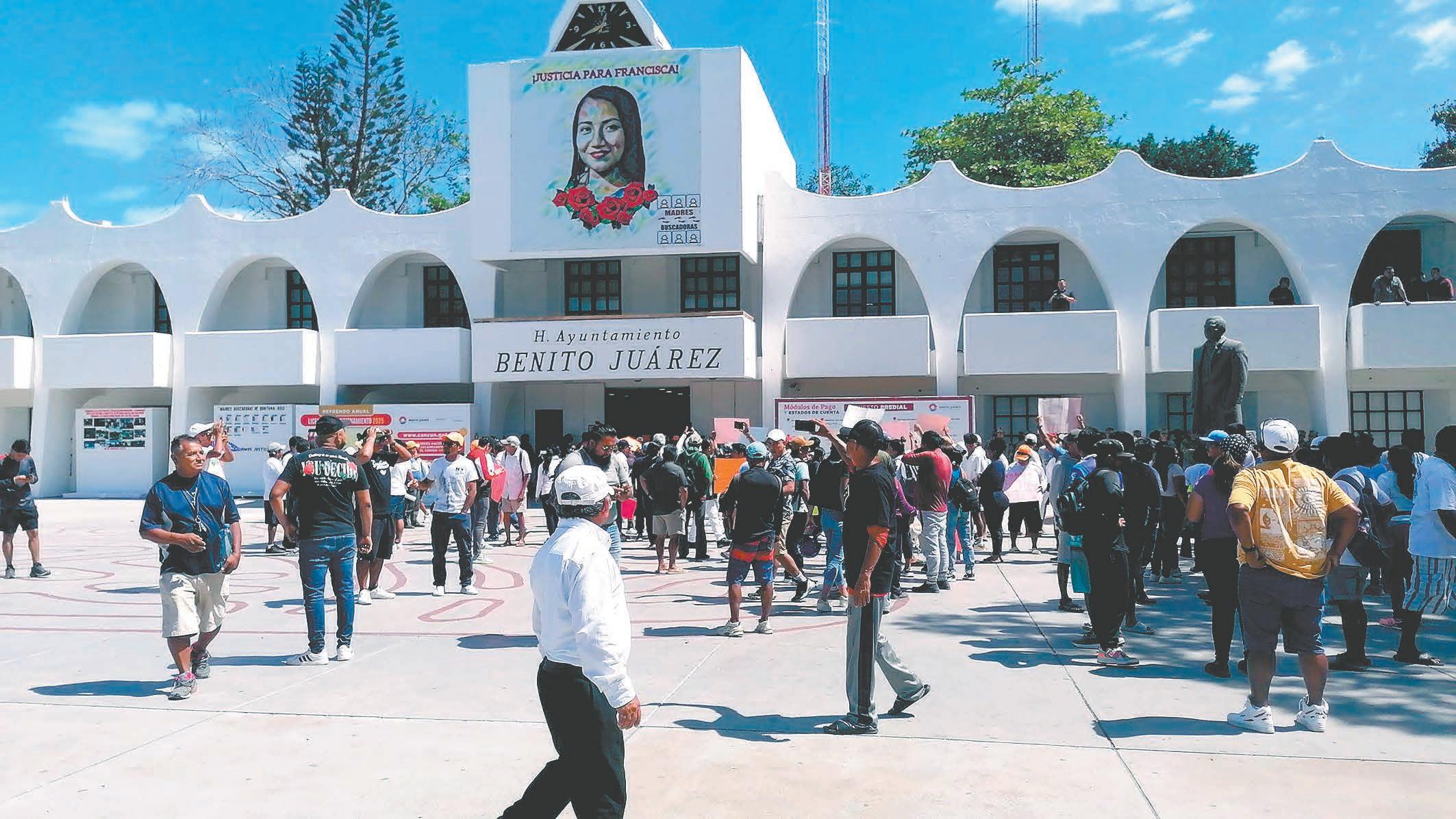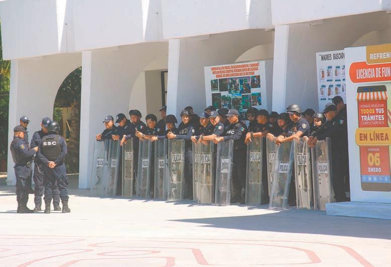 EQUIPOS antimotines se desplegaron en las avenidas Tulum y Nader, debido a la intensidad de la protesta, aunque no hubo actos violentos; los informales irrumpieron en el edificio y llegaron a la oficina de la Alcaldesa.- (Erick Romero)