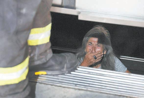 Un fotógrafo captó cuando una anciana, en shock , con la mano en la boca conteniendo el llanto, quedó atrapada en un ascensor de Santiago mientras un bombero se aprestaba a rescatarla.