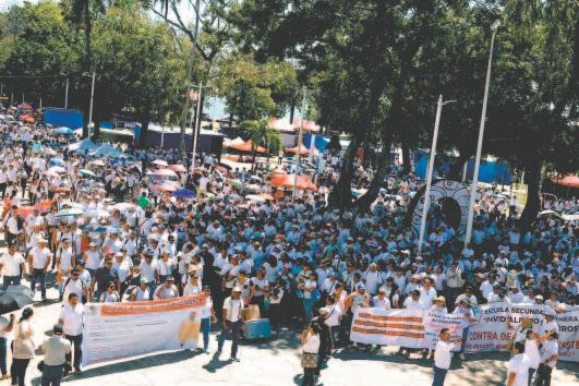 AUNQUE la convocatoria magisterial tuvo gran respuesta, especialmente en la capital, donde marchó la mayoría, en las otras ocho demarcaciones las muestras de apoyo fueron de carácter moral y la inconformidad fue de brazos caídos. Por la noche se plantaron en el Congreso del Estado.- (Jorge Villagómez)
