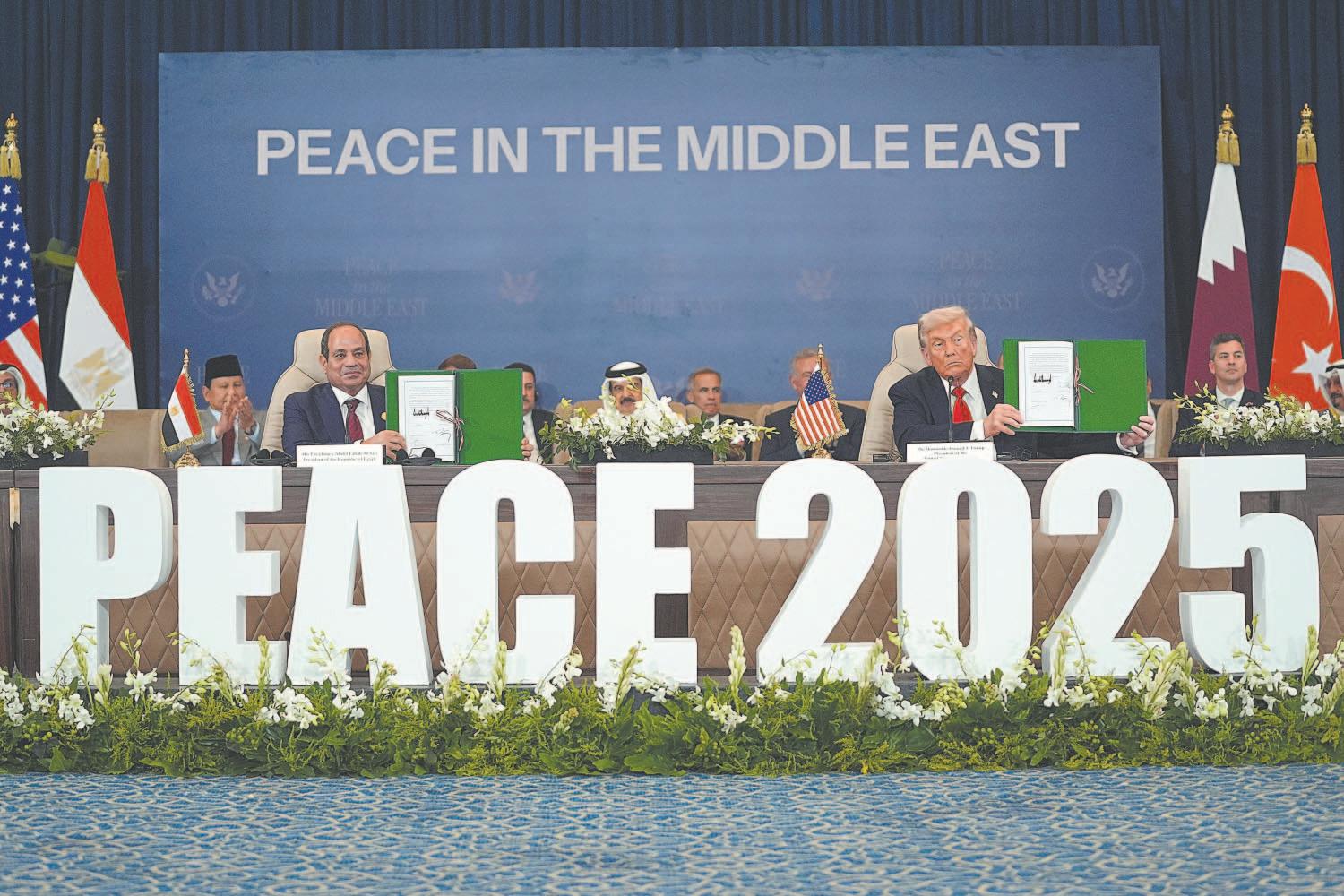 SHARM EL SHEIJ.- Los presidentes de Estados Unidos, Egipto, Turquía y el primer ministro de Qatar firmaron ayer en el balneario egipcio de Sharm el-Sheij una declaración como garantes del Acuerdo de Paz sobre Gaza, tras el inicio de la tregua entre Israel y el movimiento islamista Hamás.
