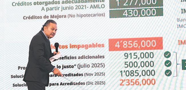 EL Infonavit anunció que el próximo mes quedará resuelta la totalidad de la cartera impagable heredada, compuesta por 4 millones 856 mil créditos. Hasta ahora, 2.5 millones ya fueron reestructurados, lo que permite a los trabajadores ponerse al corriente sin cargas excesivas.- (POR ESTO!)
