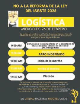 Protestas y manifestaciones magisteriales contra la reforma a la Ley del ISSSTE dejarán sin clases a 19 mil 438 estudiantes carrilloportenses, de 213 escuelas / El basurero de Felipe Carrillo Puerto se incendia nuevamente / Hay al menos 17 desarrollos sin permisos en Bacalar, informó la Secretaría de Desarrollo Territorial / El comercio ambulante crece de manera imparable en Chetumal: iniciativa privada