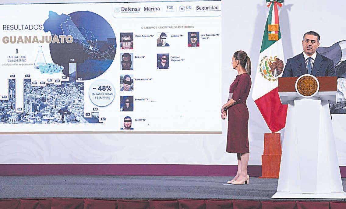 CIUDAD DE MÉXICO.- Durante los primeros seis meses del Gobierno de la presidenta Claudia Sheinbaum han sido detenidas 17 mil 258 personas por delitos de impacto, lo que ha permitido desarticular redes criminales, además que se han asegurado más de 140 toneladas de droga, incluyendo una tonelada y media y más de 2 millones de pastillas de fentanilo, informó ayer el secretario de Seguridad y Protección Ciudadana, Omar García Harfuch. Durante la conferencia matutina de la Mandataria federal en Palacio Nacional, el Secretario presentó avances de la Estrategia Nacional de Seguridad y destacó que en este medio año se han sacado de las calles más de 9 mil armas de fuego y en 17 estados se han desmantelado más de 750 laboratorios clandestinos y áreas de elaboración para metanfetaminas.