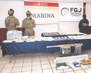 ALTAMIRA, Tamps.- Elementos de la Secretaría de Marina (Semar), en coordinación con personal de la Fiscalía General de Justicia de Tamaulipas, aseguraron droga, armamento y vehículos utilizados para actividades ilícitas en el municipio de Altamira, que representan una afectación de entre 13 y 15 millones de pesos a la delincuencia organizada.