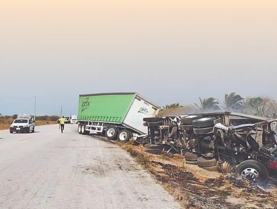 Tráiler choca, vuelca y se incendia en Sabancuy