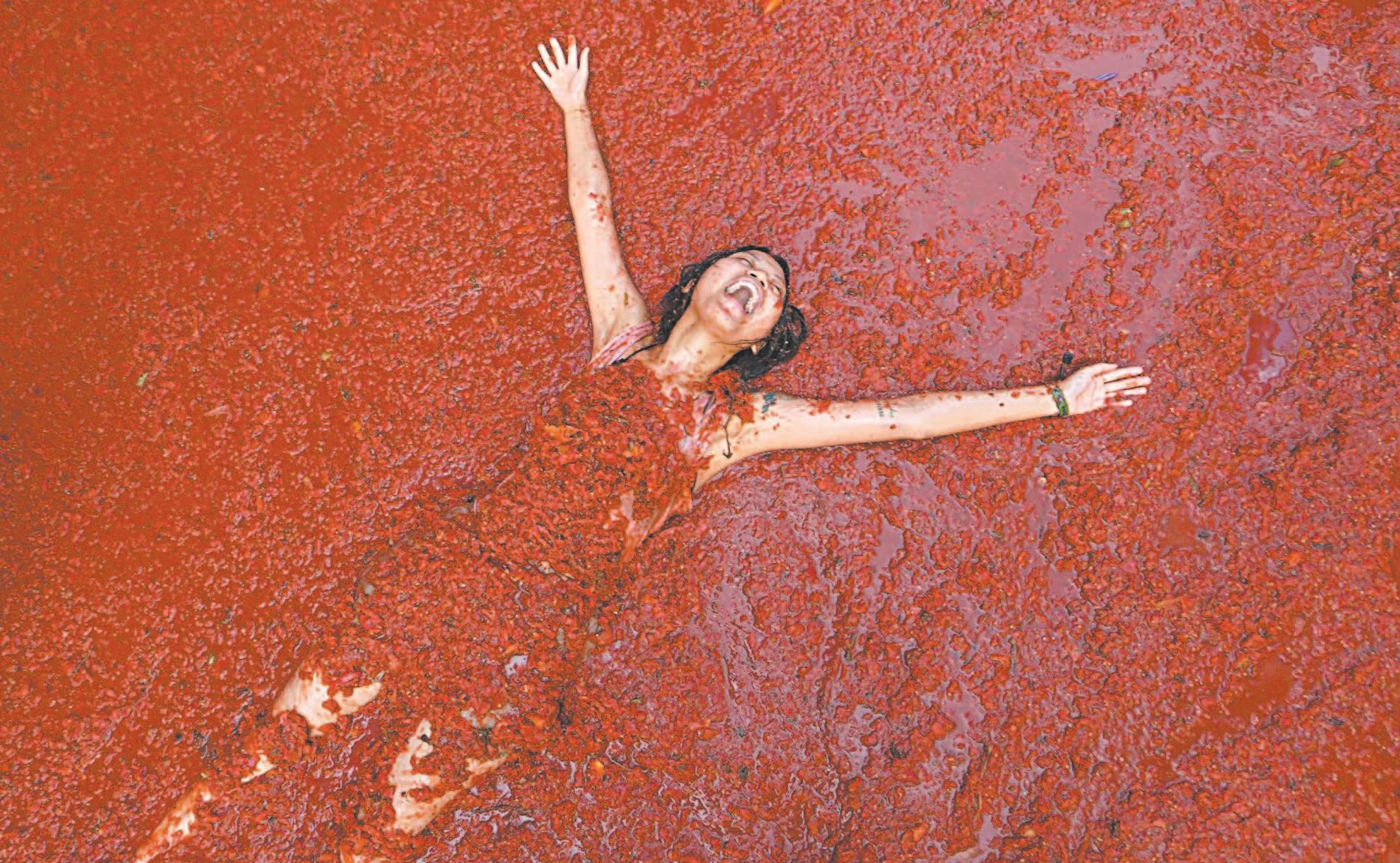 Unas 15 mil personas, entre ellas muchos turistas, se arrojaron tomates entre sí ayer durante la tradicional Tomatina en la ciudad de Buñol, en el Oriente de España. Trabajadores en camiones descargaron 120 toneladas de tomates demasiado maduros en la calle principal de la ciudad para la guerra de tomates.