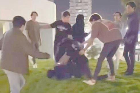 Posteriormente, la víctima quedó inconsciente después de que uno de los agresores le dio una patada en la cabeza, mientras que una mujer intenta detener las agresiones.