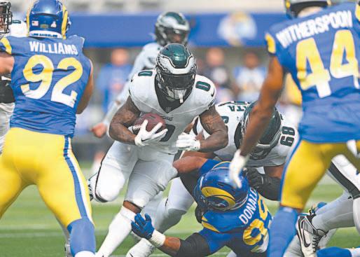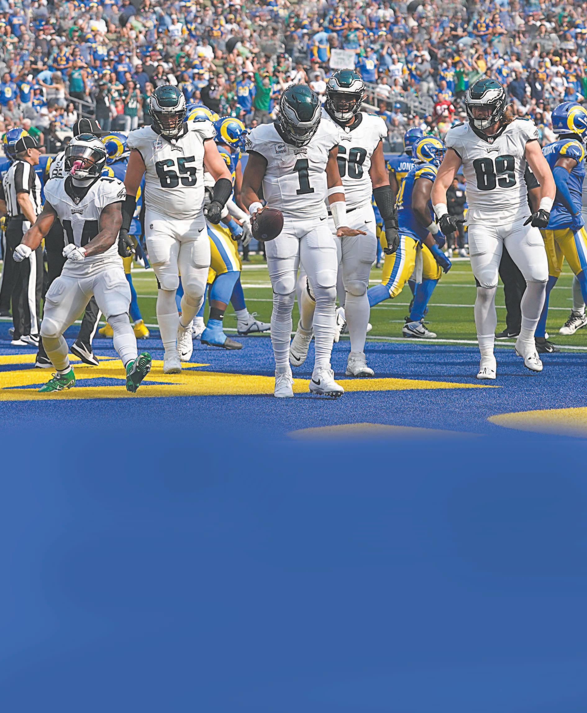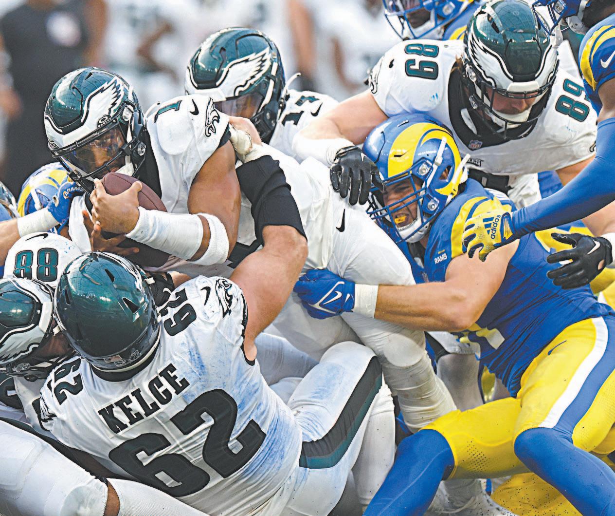 EN LOS AIRES continúa Águilas de Filadelfia, que de la mano del mariscal Jalen Hurts supera a los Rams de Los Ángeles para mantenerse líder e invicto de la Conferencia Este Nacional con un segundo inicio consecutivo de cinco victorias Página 2