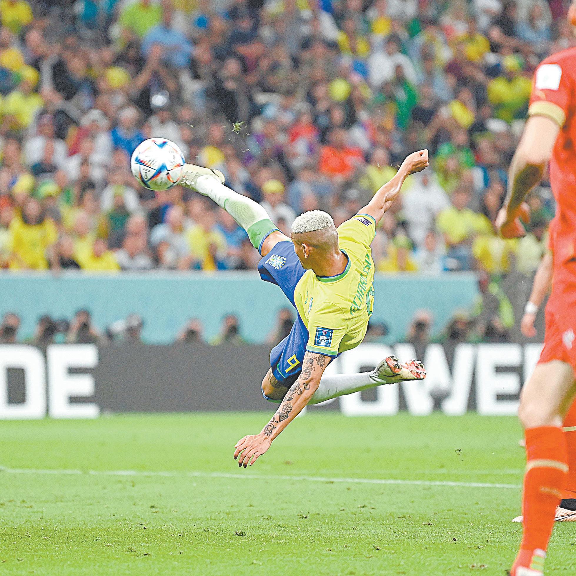 Vinicius vuelve a desbordar y lanza un centro que Richarlison remata de tijera, siendo un golazo inolvidable