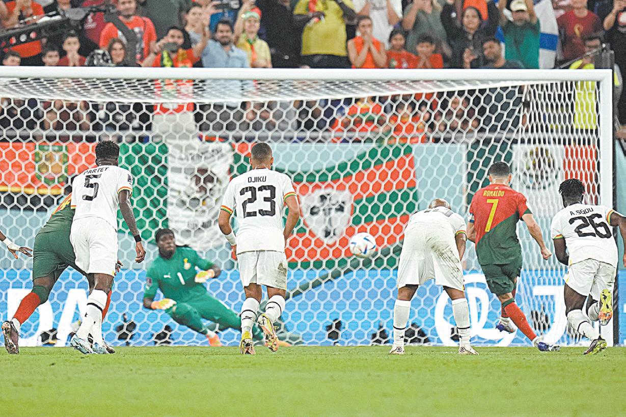 QATAR.- El hombre historia Cristiano Ro naldo se convirtió en el único futbolista que ha marcado gol en las 5 edi ciones mundialistas que ha disputado, luego de convertir un penal en la victoria de Portugal por 3-2 ante Ghana, un resul tado que rompe la malaria de debutar con el pie iz quierdo, pues desde Ale mania 2006, los lusitanos no ganaban en su estreno, cuando vencieron por la mínima a Angola.