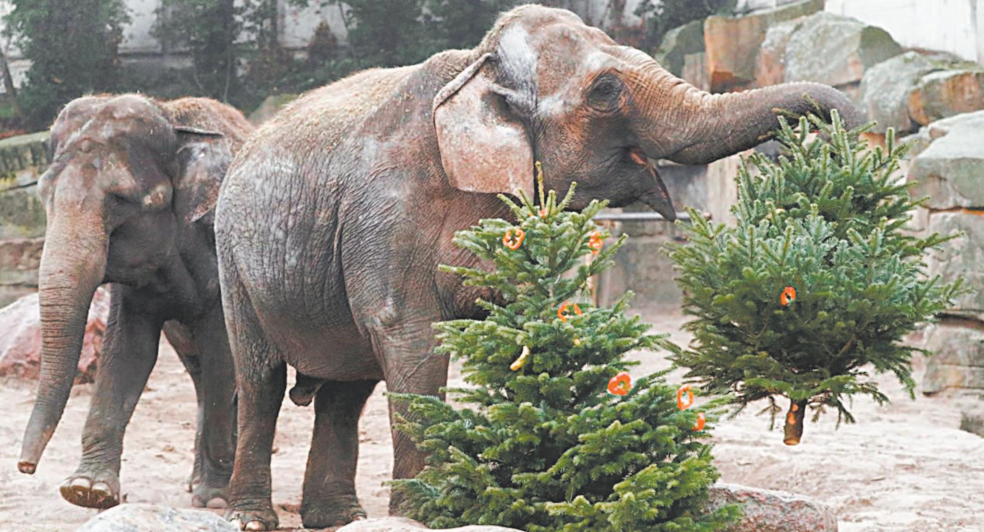 Para los elefantes y otros animales del Zoológico de Berlín, ha llegado el momento de abrir sus regalos de Navidad. Los árboles que no encontraron un hogar esta temporada festiva fueron entregados a algunos de los animales ayer en lo que se ha convertido en un evento anual. Los elefantes arrancaban ramas con sus trompas, lanzándolas por su recinto o comiendo el follaje.
