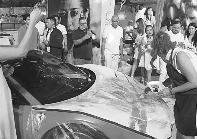 Mientras que el muralista Homero Regla pudo conjugar su amplia trayectoria en el arte con su amor por los autos. En el cofre de un modelo 488, el artista plasmó una figura humana en perspectiva como si el coche fuera una pared donde pudiera plasmar un mural.