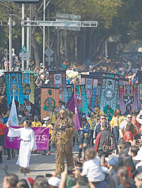 CIUDAD DE MÉXICO.- La marcha imperial de la película Star Wars llegó a la Ciudad de México ayer e inundó las calles de personajes emblemáticos de esta saga como Darth Vader, Luke Skywalker, las princesas Leia y Padme, e incluso R2-D2, C-3PO y Chewbacca
